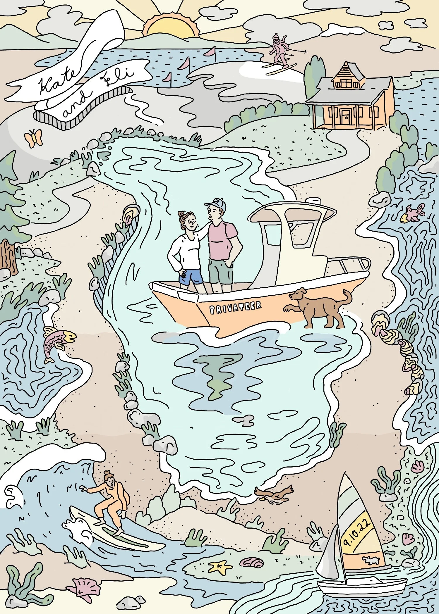 A wedding map illustration that was printed on one side of the couple’s Save the Date card.